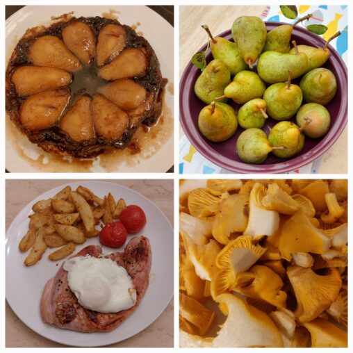 So… 2 new and intriguing experiments for this month… I’m ordering 5 truffle innoculated hazel trees to add to my little orchard!! I’m also trying to encourage chanterelle mushrooms to grow in a small wooded patch at the top of the plot. It’s a tiny shady area with beech and fir trees, and a nice layer of leaf litter and moss… it might take a couple of years for both these projects to work, but I don’t mind waiting. We’ve been eating well recently – gammon, eggs, tomatoes, and potato wedges, all home grown! Plus home grown pear tarte tatin for dessert. Delicious autumn comfort food.
